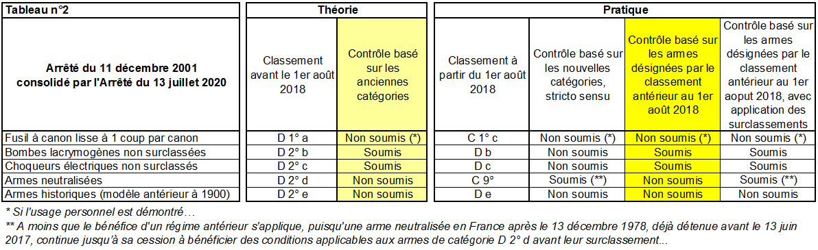 A ce jour, l’arrêté du 11 décembre 2001 (dont la dernière consolidation date du 10 avril 2024) fait toujours référence aux catégories D 1° et D 2° qui n’existent plus depuis le 1er août 2018 ! Faut-il dans ce cas l’appliquer stricto sensu, et considérer que le contrôle doit être basé sur les catégories ? Ou bien faut-il l’interpréter, et considérer que le contrôle doit être basé sur les armes désignées par l’ancien classement ? Auquel cas, faut-il également tenir compte des surclassements ? Et aussi des dérogations applicables à certaines armes surclassées ? La réponse officielle de la DGDDI en 2022 était la suivante : « Cet arrêté est en cours de modification afin, notamment, de mettre à jour les classements des armes qui y sont reprises. Dans l’attente, il convient de considérer que les armes qui étaient soumises au contrôle et qui ont changé de classement continuent d’y être soumises. Ainsi, les armes désormais classées aux a, b et c de la catégorie D (anciennement a, b et c du 2° de la catégorie D) sont soumises au contrôle. De même les armes de catégorie C, anciennement classée au 1° de la catégorie D restent soumises à contrôle. S’agissant des armes neutralisées en revanche, un justificatif ne sera pas demandé dès lors qu’est présenté le certificat de neutralisation conforme à la réglementation en vigueur et qu’elle présente notamment les poinçons de neutralisation ». On notera néanmoins que toutes les armes neutralisées dans l’Union Européenne avant le 8 avril 2016 ne sont pas forcément conformes à la réglementation en vigueur, mais que leurs détenteurs peuvent parfois bénéficier d’un régime antérieur. En outre, le certificat de neutralisation n’est pas obligatoire pour les armes neutralisées en France avant le 8 avril 2016. Par ailleurs, dans l’attente d’une mise à jour de l’arrêté, il n’est pas certain qu’un tribunal s’en tenant aux textes en vigueur valide l’interprétation de l’administration fiscale…