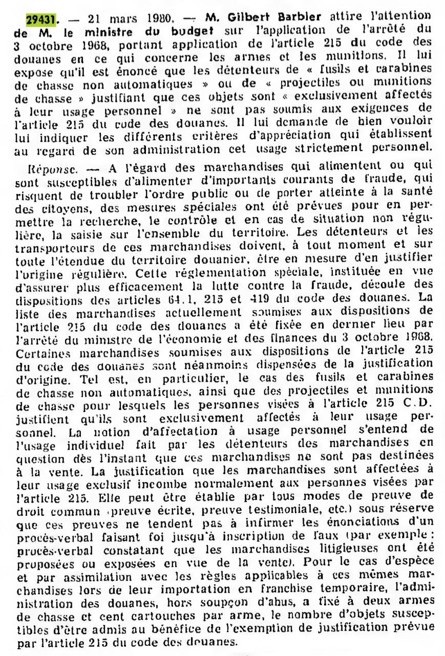 Comme indiqué dans l’arrêté, il suffit de justifier que certaines armes sont exclusivement affectées à un usage personnel pour les exclure du contrôle. C’est un peu comme pour le tabac ou l’alcool, lorsque vous revenez d’un voyage à l’étranger : vous avez droit à une quantité par passager, sur laquelle vous n’avez pas à payer de taxes d’importation. Dans la réponse à la question écrite du 21 mars 1980 [3], le Ministre du budget de l’époque indiquait que l’on pouvait ainsi bénéficier de la franchise temporaire sur 2 armes de chasse et sur 100 cartouches par arme importée. Aussi, les dernières jurisprudences ont montré que la licence de tir ou le permis de chasser pouvaient justifier l’usage personnel d’armes et de munitions classées en catégorie C (ou D)… sans limitation de quantité, ou de valeur ! De fait, le tireur qui transporte ses armes en présentant sa licence de tir comme motif légitime justifie simultanément de leur usage personnel ! Du moins pour celles qui sont classées en C et qui sont utilisables à la chasse, puisque cela fait partie des conditions d’exonération…