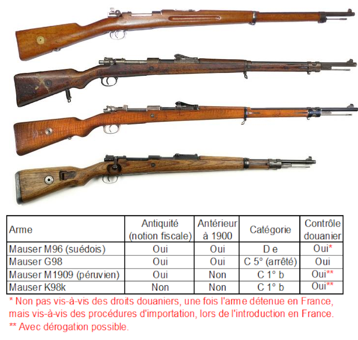 [4) Il existe toutefois des exceptions, comme certaines armes bénéficiant d’un régime antérieur suite à leur sur-classement. Outre les armes dont la déclaration vaut autorisation viagère, on peut citer : les armes d’épaule à 1 coup par canon (ex-5e catégorie), déjà détenues avant le 1er décembre 2011, qui restent libres jusqu’à leur cession (article 18 du décret n°2011-1253) ; les armes d’épaule à 1 coup par canon (ex-D 1° a), acquises après le 1er décembre 2011 et déjà détenues avant le 13 juin 2017, dont l’enregistrement est suffisant jusqu’à leur cession (article 33 du décret n°2018-542)… et éventuellement, si les contrôles douaniers s’y appliquent : les armes neutralisées en France après le 13 décembre 1978 (ex-D 2° d), déjà détenues avant le 13 juin 2017, qui restent libres jusqu’à leur cession (article 33 du décret n°2018-542).